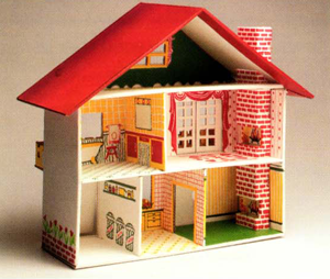 My First House creates a lot of quality playtime at a resonable price. Made with high quality corrugated cardboard with special folding tab locks and snap fasteners that are easily assembled in 6 basic steps achieving a structure that is exceptionally strong and durable. A set of illustrated assembly instructions are included. Actual size is 22" x 18" x 10" and includes 6 pieces of furniture. Two twin size beds, one double bed, two chairs and a table. All consist of a singular piece of corrugated material that is designed to fold together into it''s own particular shape.