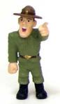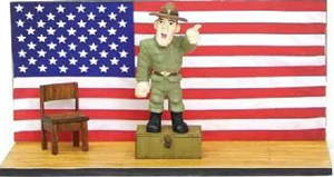 This is Gunny on his patriotic platform. He has very small magnets imbedded in his boots so that he can attach to any metal surface. Includes the platform with large American flag in the background. His stage has a small chair and what looks like a footlocker that he uses to stand on.