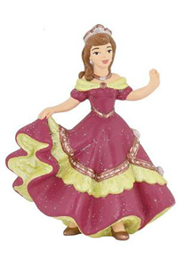 Am I pretty enough to dance with the Prince? Dressed in her pretty dark pink and green gown she loves to show off her matching green petiticoats. This demure Princess has long auburn hair with a shiny pink crown. Her shiny shoes match the pink in her gown and she is ready to dance!