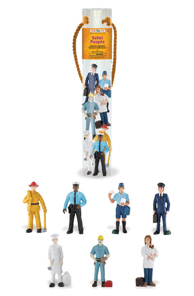 Our heroes most of the time these figures are here for us when we need them most. The fireman who saves our house or property or maybe our lives and the policeman who tries to keep us safe and comes to the rescue when we are in trouble. This policeman has dark skin and unlike the picture he is wearing a dark shirt that matches the pants and tie. The mail person who delivers the mail no matter what the weather is like and the pilot who flies to where we need or want to go. The chef cooks when we want a change or just don't feel like cooking and the carpenter who fixes what breaks or what we just want changed. And the Veterinarian who takes care of the furry members of the family. They each carry tools of their trade. Many scenes may be acted out by these important figures. They come in a reusable cylindrical tube for easy storage and transportation.